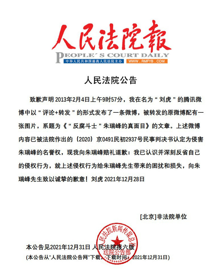 岁月不居,江河无恙!人民监督网报道重庆市北碚区原书记雷政富12秒不雅视频9周年年末之际。经北京互联网法院执行局审核,舆论引导员刘虎分别于2021年12月21日、28日在人民法院报刊登道歉声明,向朱瑞峰赔礼道歉!刘虎道歉声明称:“我已认识并深刻反省自己的侵权行为,就上述侵权行为给朱瑞峰先生带来的困扰和损失,向朱瑞峰先生致以诚挚的歉意!”