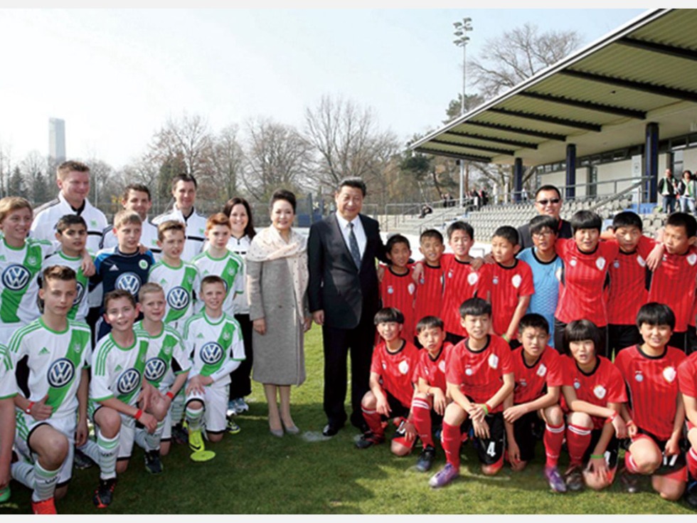 2014年3月29日,习近平来到德国柏林奥林匹亚体育场足球场,看望在那儿训练的陕西志丹县的中国少年足球运动员。这是习近平和夫人彭丽媛与中国少年足球运动员及共同训练的沃尔夫斯堡足球俱乐部少年队员合影。习近平踢球照虽然“撤”了,但是,与足球有关的照片,还是有的。