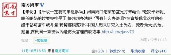 覆巢之下,岂有完卵。@南方周末在微博上发表来论质疑:“平坟一定要简单粗暴吗?”文章作者系祖籍河南省周口的北京市委宣传部的调研员,他表示因老家周口祖坟被平,自家祖先坟头已成一片废墟,自己与那片土地已没有任何联系。文章对周口市强制平坟举措提出强烈控诉。正处级京官尚且如此,当地普通民众情何以堪!学者网友“章立凡”颇为严厉地批评当地政府,“民之所好好之,民之所恶恶之”。