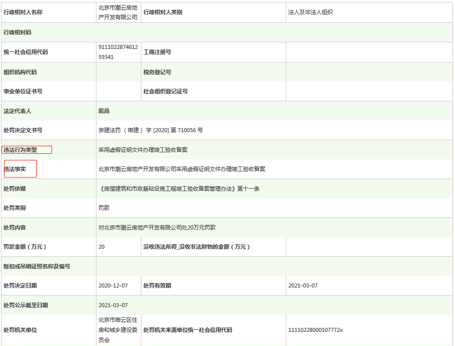 北京市密云区住房和城乡建设委员会处罚决定日期为2020127日;公示日期为20201216日。