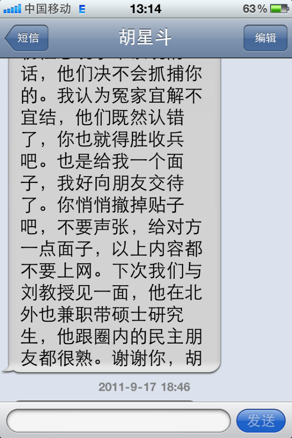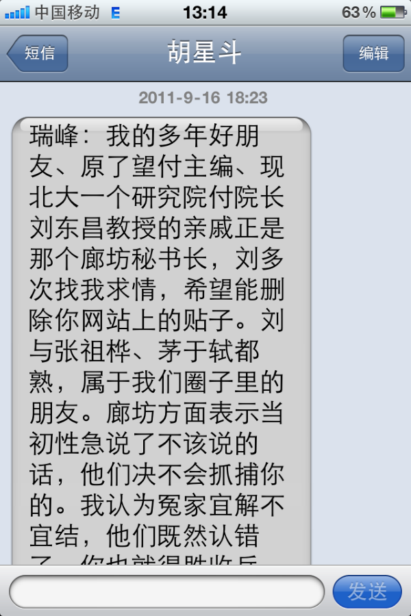三、2011年9月16日18点23分,胡星斗教授发来手机短信:瑞峰:我的多年好友、原《瞭望》副主编、现北大一个研究院副院长刘东昌教授的亲戚正是那个廊坊秘书长,刘多次找我求情,希望能删除你网站上的帖子。刘与张祖桦、茅于轼都熟,属于我们圈子里的朋友。廊坊方面表示当初性急说了不该说的话,他们绝不会抓捕你的。我认为冤家宜解不宜结,他们既然认错了,你也就得胜收兵吧。也是给我一个面子,我好向朋友交代了。你悄悄撤掉帖子吧,不要声张,给对方一点面子,以上内容都不要上网。下次我们与刘教授见一面,他在北外也兼职带硕士研究生,他跟圈内的民主朋友都很熟。谢谢你,胡