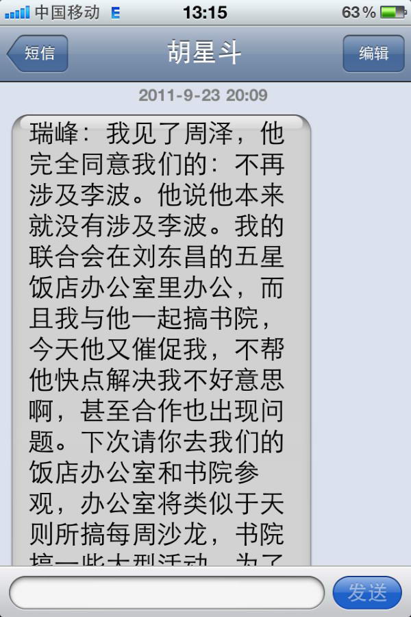 五、2011年9月23日20点09分,胡星斗教授发来手机短信:瑞峰:我见了周泽,他完全同意我的:不再涉及李波。他说他本来就没有涉及李波。我的联合会(国际著名企业家慈善家联合会)在刘东昌的五星饭店办公室里办公,而且我与他一起搞书院,今天他又催促我,不帮他快点解决我不好意思啊,甚至合作也出现问题。下次请你去我们的饭店办公室和书院参观,办公室将类似于天则所搞每周沙龙,书院搞一些大型活动。为了我与他的合作顺利,还是请尽快删除李波的内容,不妨碍继续整个案件。今天他说最好今天能删除,我怎么回答他啊?