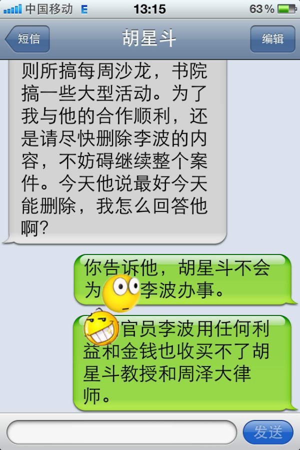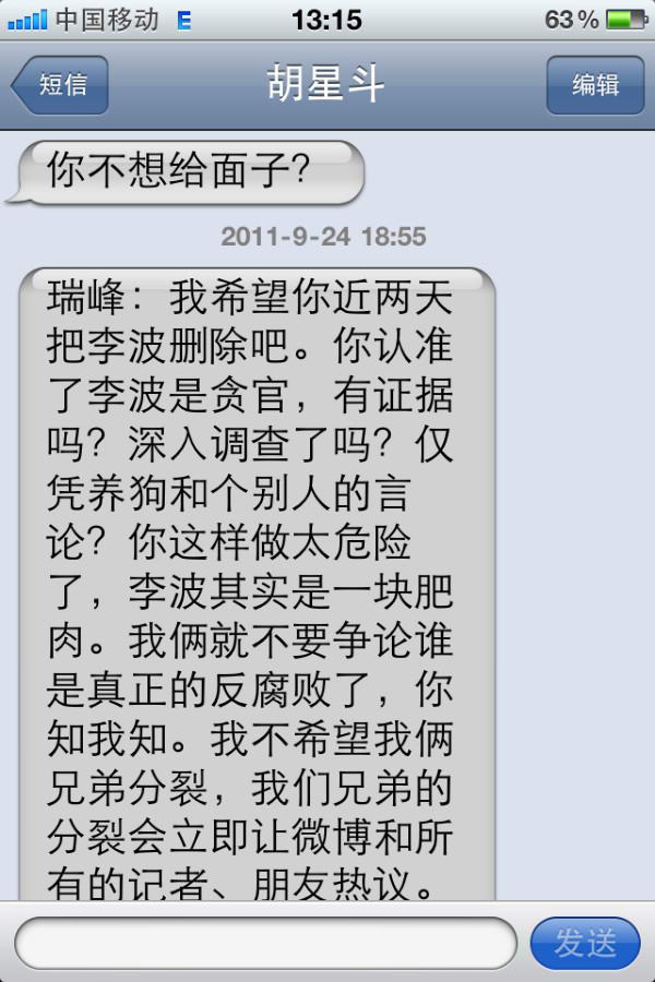 七、2011年9月24日18点55分,胡星斗教授发来手机短信:瑞峰:我希望你近两天把李波删除吧。你认准了李波是贪官,有证据吗?深入调查了吗?仅凭养狗和个别人的言论?你这样做太危险了,李波其实是一块肥肉。我俩就不要争论谁是真正的反腐败了,你知我知。我不希望我俩兄弟分裂,我们兄弟的分裂会立即让微博和所有的记者、朋友热议。你前面答应我的,我相信你能做到。给我面子,你不会吃亏,反之大家都受害。我之所以这么认真不仅因为关系到我与朋友的事业合作,更是涉及对于一个人是贪官还是普通官员由谁来认定?是否可以不经调查而认定?也涉及对朋友的考验。这是我最后一次为这事给你短信,我希望以后我们还是师生俩、兄弟俩。