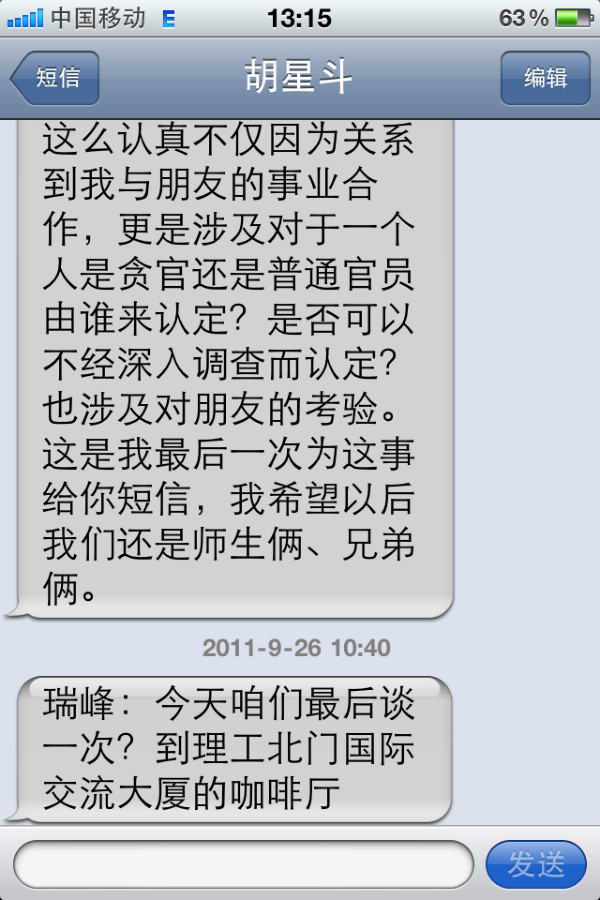 八、2011年9月26日10点40分,胡星斗教授发来手机短信:瑞峰:今天咱们最后谈一次?到理工北门国际交流大厦的咖啡厅。