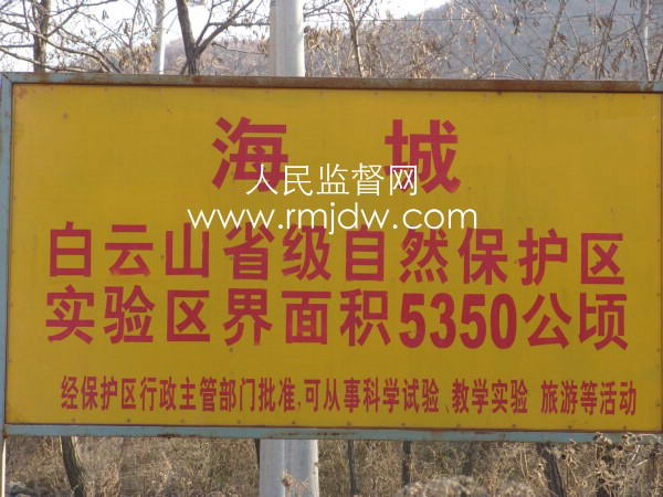 核心提示:2008年10月28日,辽宁省设立了白云山省级自然保护区,面积5350公顷。然而,人民监督网记者于2009年11月2日在海城市孤山镇瓦子沟村采访时,却亲历着自然保护区界碑内炮声隆隆、挖掘机轰鸣的采矿活动,竖立在瓦子沟村口醒目的“根据国务院《中华人民共和国自然保护区条例》设立海城白云山省级保护区界”的界碑成了一块摆设。