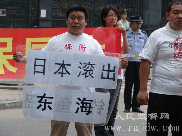 他们在日本使馆前喊着震天的抗议口号:“日本滚出东海”、“日本滚出钓鱼岛”、“声援台湾同胞”、“日本必须认罪”、“日本必须谢罪”、“反对日本入城”、“祖宗基业,誓死必保”、“日本必须赔偿”、“打到日本军国主义”、“东海中国的”、“东海——中国的”、“钓鱼岛中国的”、“钓鱼岛——中国的”。