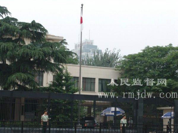 《人民监督网》记者看到,一位日本使馆官员在大门铁栅栏里面向外窥望,并用笔在本子上记录者。示威领队用喇叭对记者采访区说:“世界各国的记者朋友们记住了,日本人的德行,OK,我们给他们送过去”。最后由示威代表张立昆先生将“抗议信”投至日本使馆信箱。