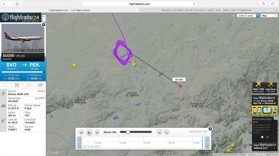 flightradar24 网站上显示的俄航SU200空中盘旋轨迹。
