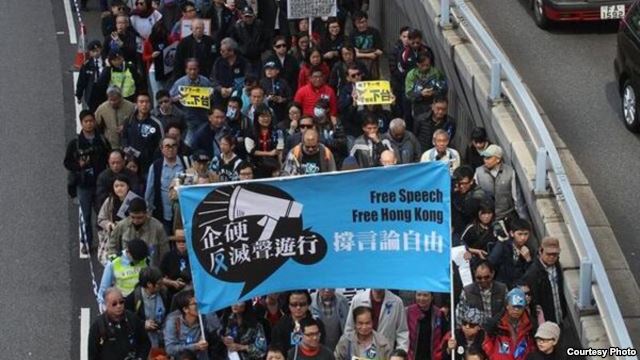 香港记者协会星期天下午发起“企硬反灭声,撑言论自由”的游行。一千多位身别象征言论和新闻自由蓝丝带的游行人士,在中环遮打花园集合后出发,前往行政长官梁振英德特首办外集会。