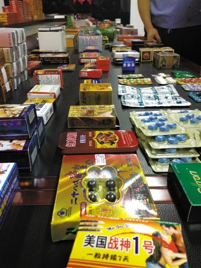 这是广东警方7月25日查扣的假性药。从名称直白露骨的国产性药,到铺满外文的“万艾可”、“西力士”等外来品,一应俱全。
