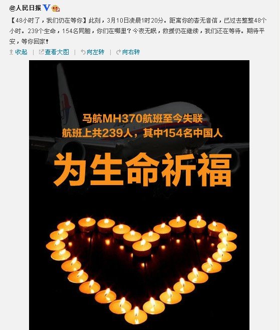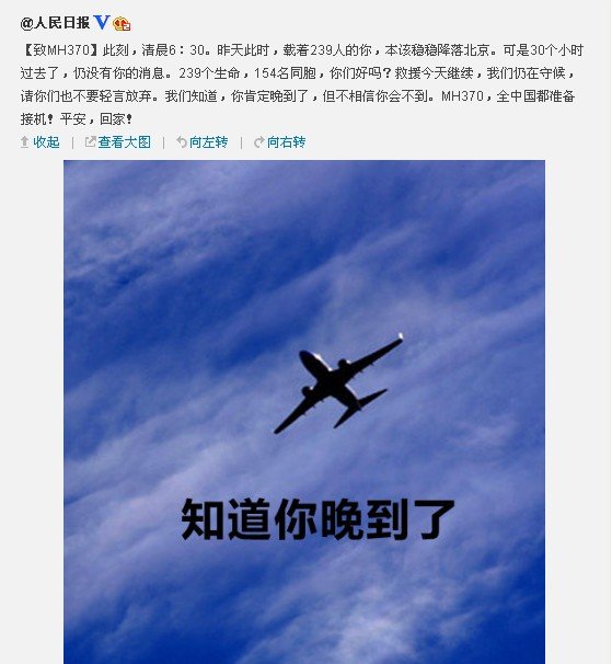 今早7:00,人民日报官微发布了一条“再致MH370”微博。称又一个黎明来临。此刻,你已失踪近54小时。239个生命,154名同胞,快回来!所有人都在祈祷,全中国等你进港。今天,救援仍将继续,我们还在守候。坚持,努力,说好不放弃。无论结果如何,我们在一起。等待奇迹!等你回家!