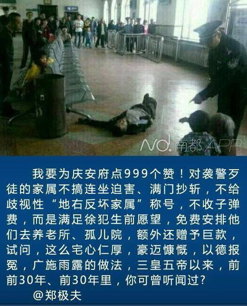 可是我实在无话可说。我只觉得所住的并非人间。一个患有先天性心脏病、肾炎、肺炎等疾病的四十多岁的男人,带着八十多岁的老母,还有三个3到7岁的幼儿,买票进站却被阻挡,于是争执,于是开枪,于是喋血……鲜红的血液,从三个幼儿的父亲一个精神病女人的丈夫和一个八十多岁的老母的儿子的胸膛喷涌而出,洋溢在我的周围,使我艰于呼吸视听,哪里还能有什么言语?长歌当哭,是必须在痛定之后的。而此后几个所谓主流媒体记者和官方发言人颠倒黑白的阴险论调,尤使我觉得悲哀。我已经出离愤怒了。我将深味这非人间的浓黑的悲凉;以我的最大哀痛显示于非人间,使它们快意于我的苦痛,就将这作为苟活者的菲薄的祭品,奉献于诸多死于非命者的灵前。