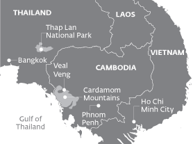 豆蔻山(Cardamom Mountains)位于柬埔寨首都金边西北方向,距金边有一段很长的车程。通往菩萨省省城的铺好的公路接上了一条土路,土路穿越绵延几英里的人烟稀少的村庄。一个标着排雷项目的指示牌提醒着人们,这里曾是红色高棉的地盘。这支1975年上台的狂热势力曾掌管该国政权,在杀戮场和劳改营里发起了种族屠杀。
