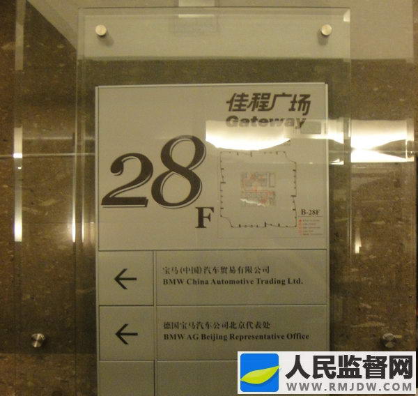 记者乘电梯来到28层,看到楼梯口悬挂着“德国宝马集团北京代表处”及“宝马(中国)汽车贸易有限公司”标牌。记者随一位持门禁卡的工作人员进入了宝马中国玻璃门,并亮证向前台接待