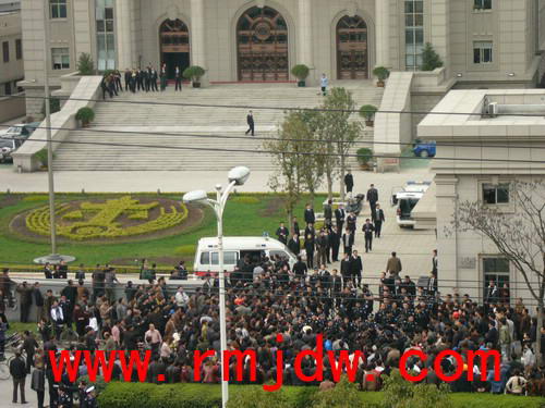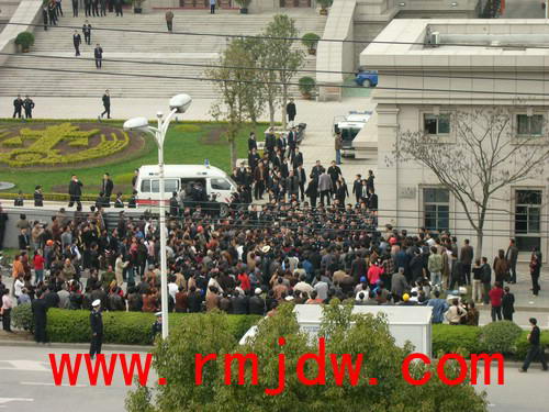 吴增仁案一审开庭当天,阴雨霏霏,近千名被挡在法院大门外的村民等候着审判的结论,整整 12 个小时。 晚上 20点40分 ,吴增仁等被告人被押上返回看守所的囚车时,数百名村民在法院大门外集体下跪,大呼冤枉,持续了约半个小时。