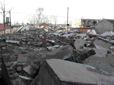 2006年11月,该县政府在这里打响了一场轰轰烈烈的“拆违战役”――大批防暴警察、城管人员、120医生,甚至还有两辆殡仪馆的棂车也投入了“战斗”。六里村居民的房屋很快就土崩瓦解。被强行拆除的房屋,大部分是近年来建造的砖混结构的新楼房。