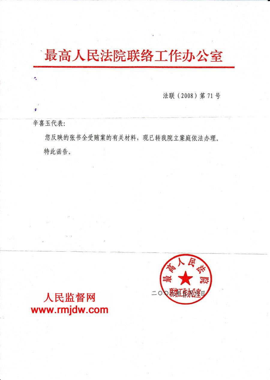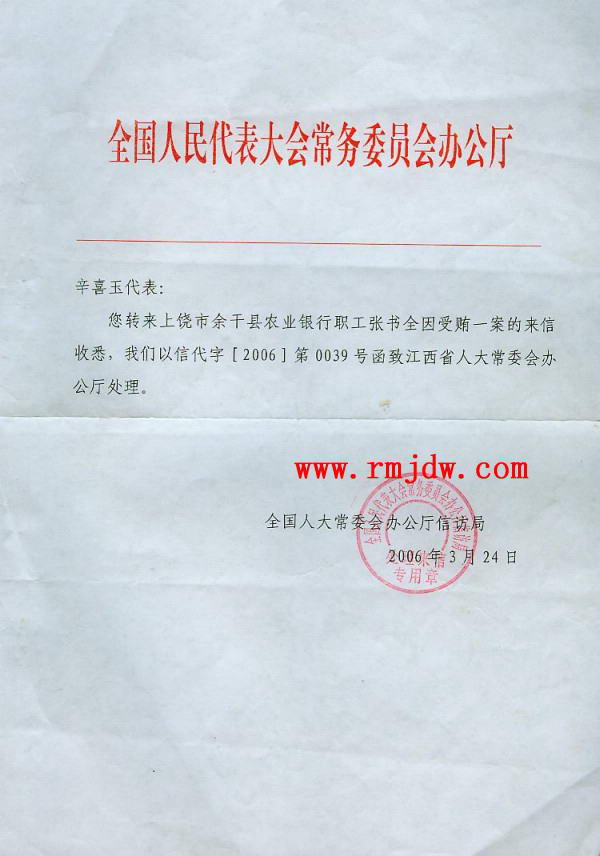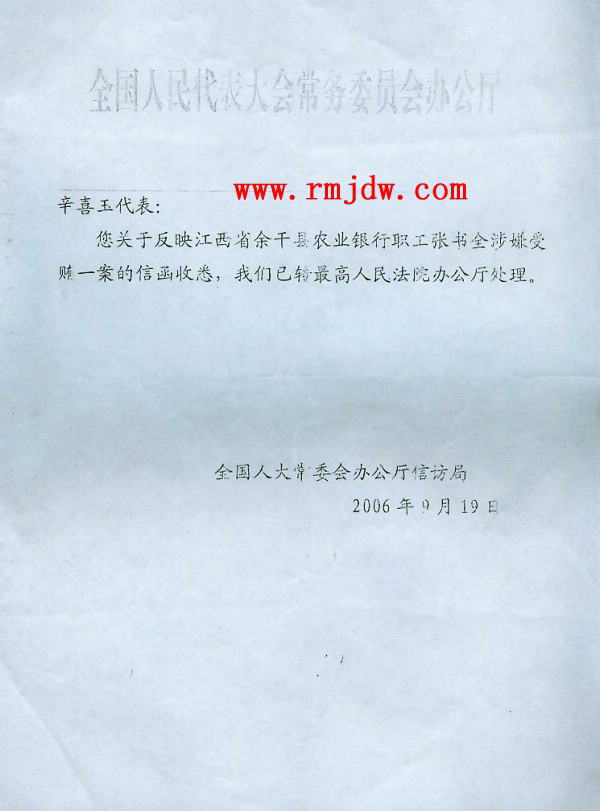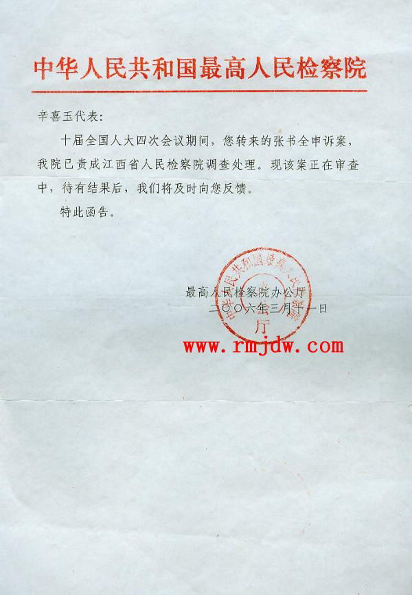 无奈之中,我于2006年6月13日又致函全国人大内司委,将江西省人大、省检察院对张书全申诉案地方保护的做法进行反映。2006年9月19日,全国人大常委会办公厅信访局复函已转交最高人民法院办公厅处理。2007年3月9日,我又致函全国人大内司委、最高人民检察院对此案进行再次监督。