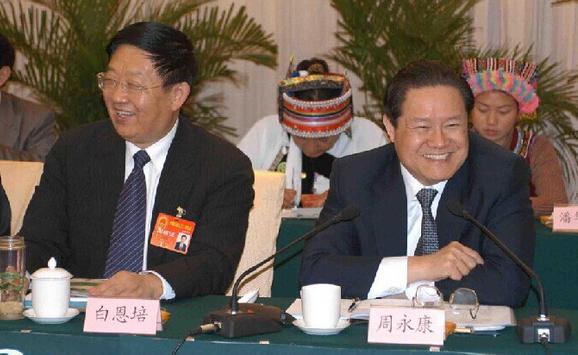 2004年3月,周永康到全国人大云南代表团参加审议,原云南省委书记白恩培在会上。中新社 发 季肖虹 摄