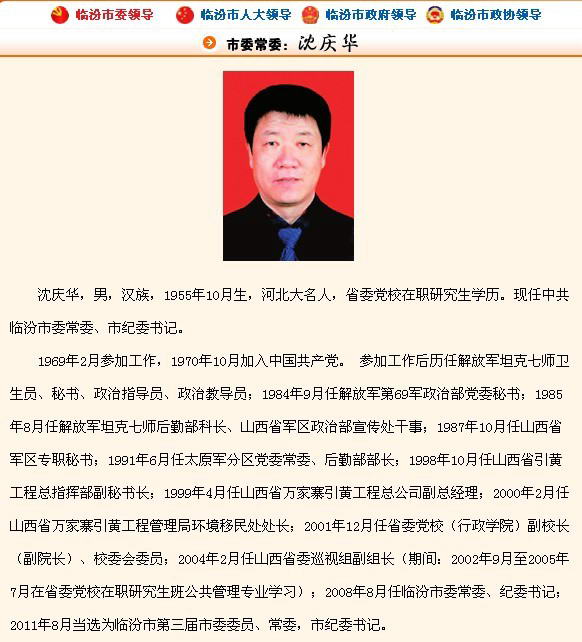 在临汾政府网上领导干部介绍栏目中,本人发现了纪委书记沈庆华“13岁参军、15岁入党”的弱智简历,相信广大干部群众都发现了这个侮辱广大党员干部群众智商的假档案,沈庆华是省管干部,不知道作为组织部长的您有没有看过这个滑天下之大稽的干部简历?临汾政府网站上,沈庆华的简历赫然在列:“195510月出生,19692月参军,197010月入党”,无数网友发出疑问:“沈庆华15岁入的什么党,是少先队吧?!”不知道作为组织部长的您看了这份简历,有没有用简单的加减法计算一下?