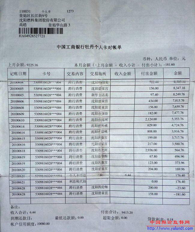 有知情人告诉记者:上图是尚皓一个银行卡2010年6月份一个月份的消费,其中仅洗浴就消费了8000多元,其他的银行卡消费还不算。尚皓去酒店请客用的都是公款,所以另外消费未计在内。