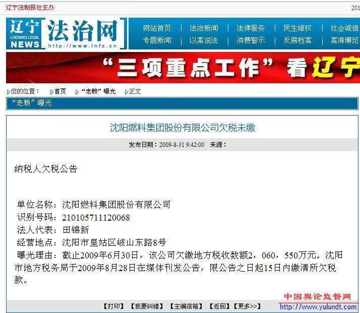 2009年8月31日,辽宁法制报社的辽宁法治网开办了《“老赖”曝光》栏目,将辽宁省欠税和偷税的企业给予曝光,在这期“纳税人欠税公告”上,记者发现沈阳燃料公司欠税的消息:截止2009年6月30日,该公司欠缴地方税收数额2,060,550万元。沈阳市地方税务局于2009年8月28日在媒体刊发公告,限公告之日起15日内缴清所欠税款。