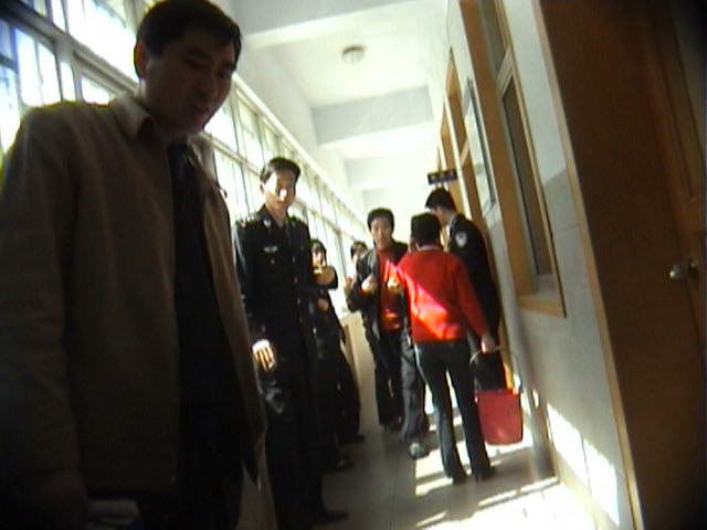 罪犯李新华试图冲破民警的警戒线殴打采访的记者。