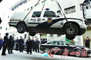撞死小男孩的警车被吊走。记者高鹤涛 摄