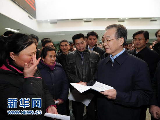 1月24日,中共中央政治局常委、国务院总理温家宝前往国家信访局,与来访群众进行面对面交流,了解他们的困难和要求,并就政府工作听取意见。这是在信访局接待大厅,温家宝总理向来访群众了解他们的诉求情况。新华社记者李涛 摄