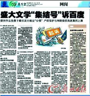 2010年11月16日本报A12网闻版曾以《盛大文学“集结号”诉百度》为题,对盛大文学联合起诉百度文库一事进行过报道。