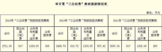 根据审计署公布的数字,其去年的“三公”经费财政拨款预算为2711.65万元,当年决算即实际支出2488.79万元,减少了222万余元。相比之下,今年“三公”经费预算为2687.06万元,比去年的预算少了24万余元,比去年实际支出多198万余元。