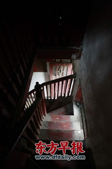 百年“精武会”老办公楼,红色木楼梯保留着原始风貌。目前,拆迁工人临时居住在老房内。