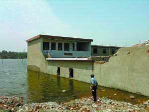 现在的朱庄村,许多地方已大面积坍塌,积水将房屋、田地淹没,电线杆子间或在水面露出一小节。