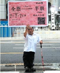 李冲一只手高举一张标着“优惠”列车的火车票,另一只手拄着拐杖支撑身体。自制 “特大火车票”起始站为“全票”,终点站为“半票”。“火车票”中间的出发时间画着几个大大的问号。