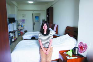 进入公寓,每层有一间公共厨房,内有电磁炉、微波炉、橱柜等。宿舍门为电子门卡。在5号楼5层一间宿舍,该宿舍内住两人。宿舍有空调、电视、衣柜和冰箱。床是宾馆大床,有软床垫。前日,住在该宿舍的一名日本女生正在读《汉语口语速成》。该女生介绍,她叫西野光,作为北大的交换生,在对外汉语教育学院读大四。她是公费生,每天交房租45元。