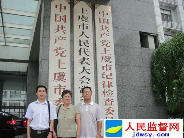 图:法学博士滕彪(右一)、访民王苗珍(中)、调查记者朱瑞峰(右三)在中共上虞市纪律检查委员会