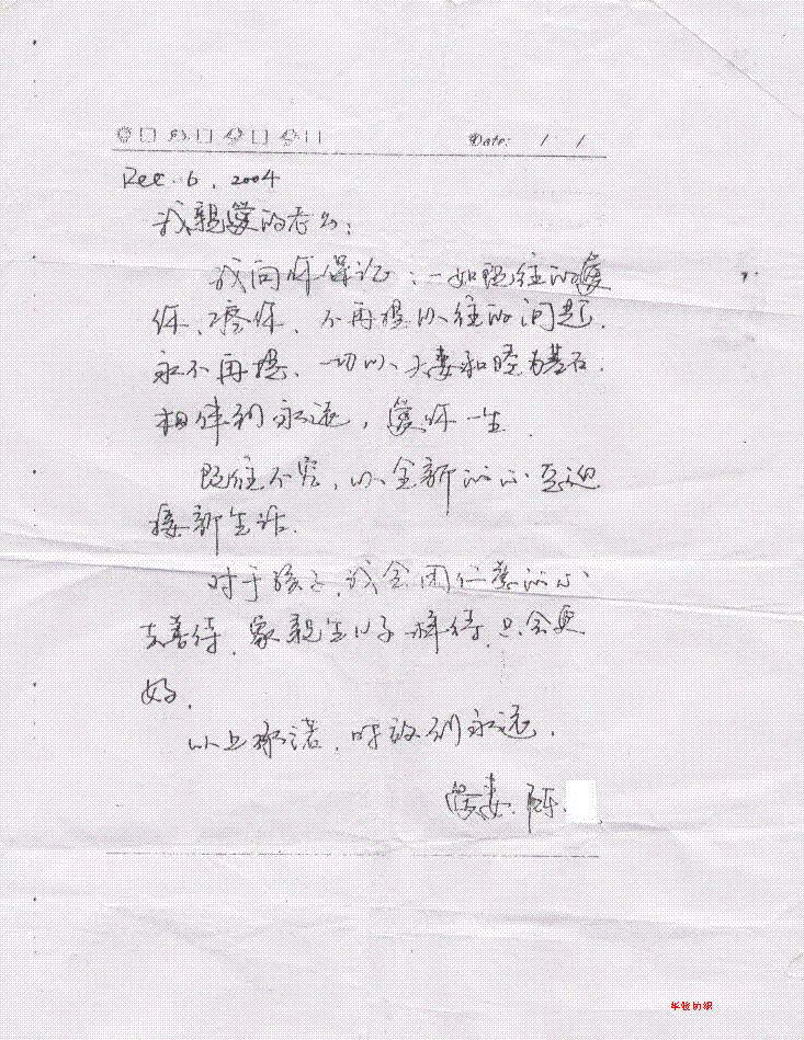 证据7:董锋重婚的女人陈x写给董锋的承诺书照片